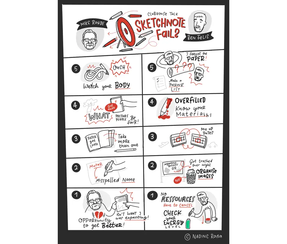 Clubhouse Talks sind super geeignet, um Sketchnotes ganz frei und ohne Druck zu üben. Und wenn man dabei noch was lernt, um so besser. In diesem Talk sprachen niemand geringeres als der Sketchnote Erfinder Mike Rohde mit Ben Felis über ihre 5 größten Sketchnote Fails.