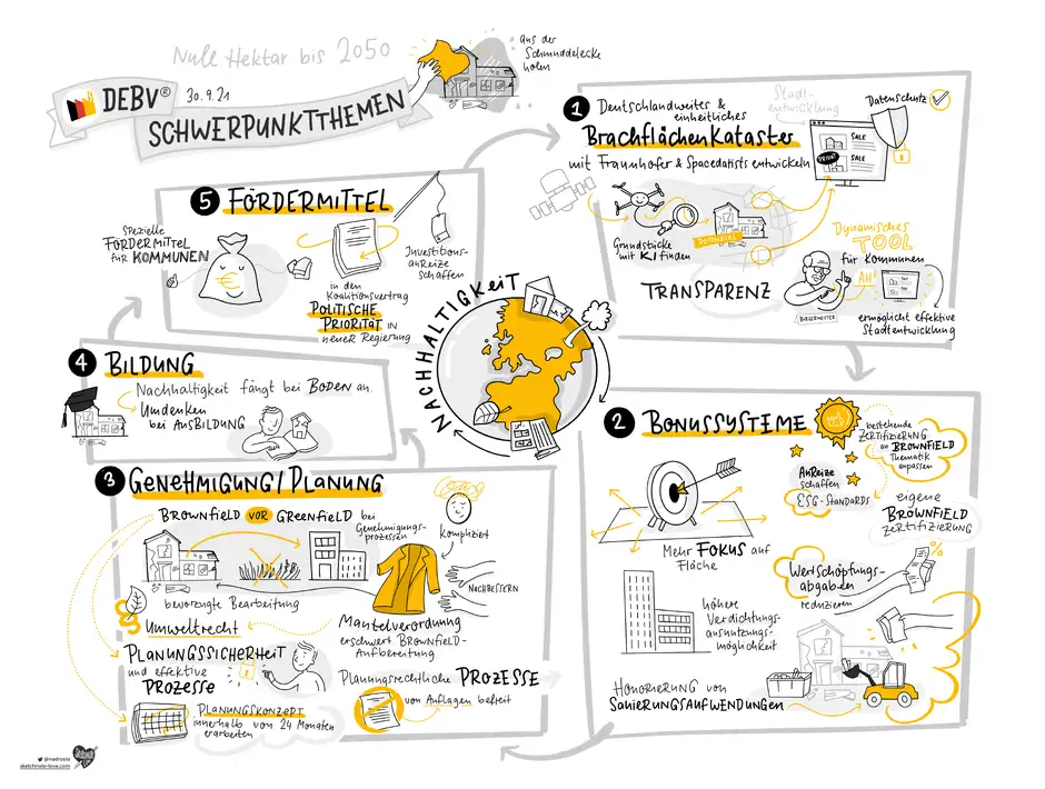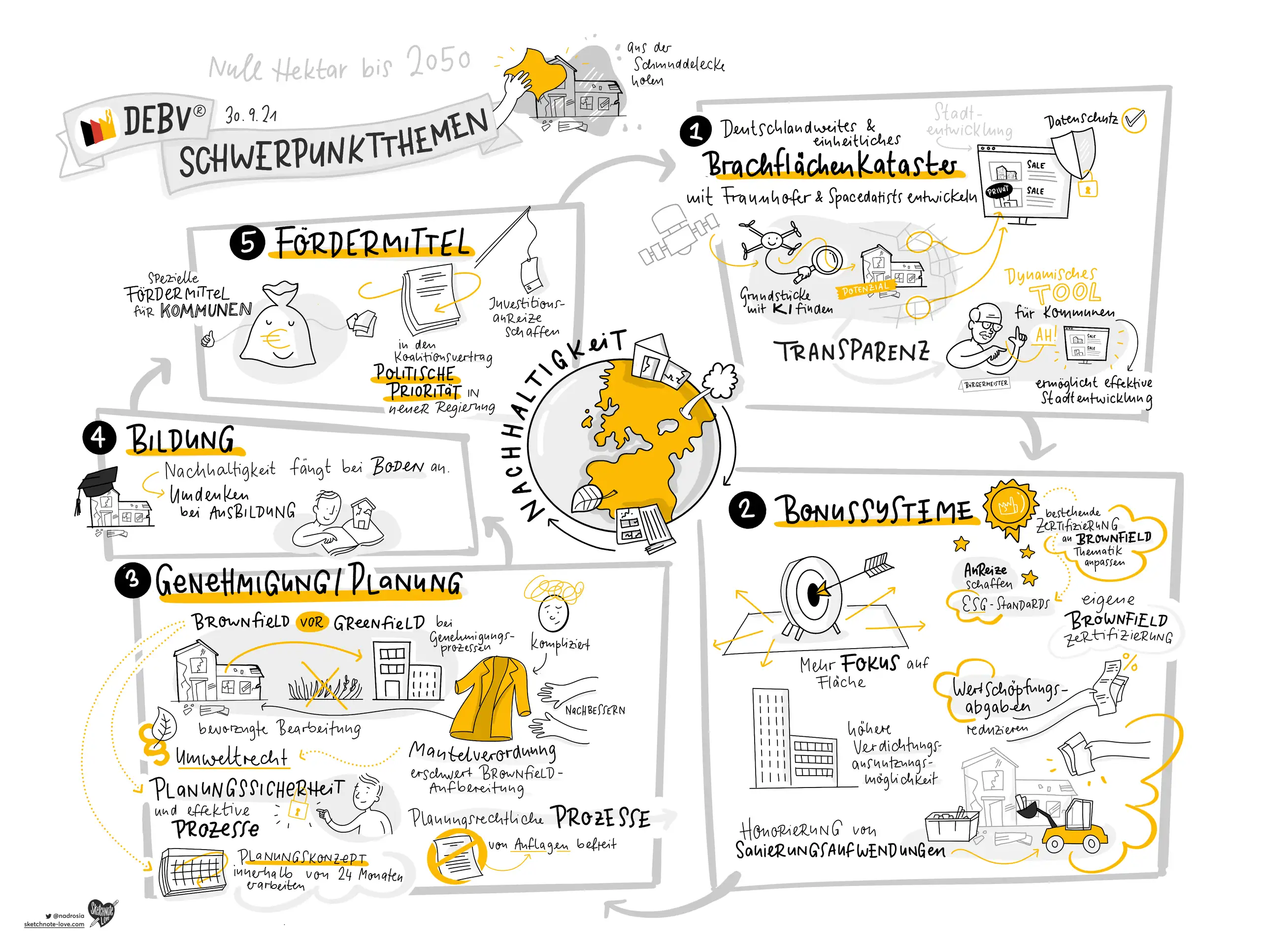 Was ich sehr liebe an meinem Job als Graphic Recorderin? In Themen einzutauchen, die ich sonst nicht mal ansatzweise berühren würde. Zum Beispiel: Die Nutzung von Brachflächen und deren Vorteile. Ich durfte mit dem DEBV zusammen die Schwerpunktthemen visuelle erarbeiten und aufbereiten.