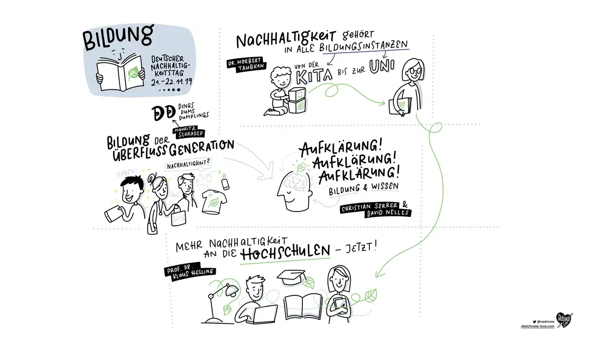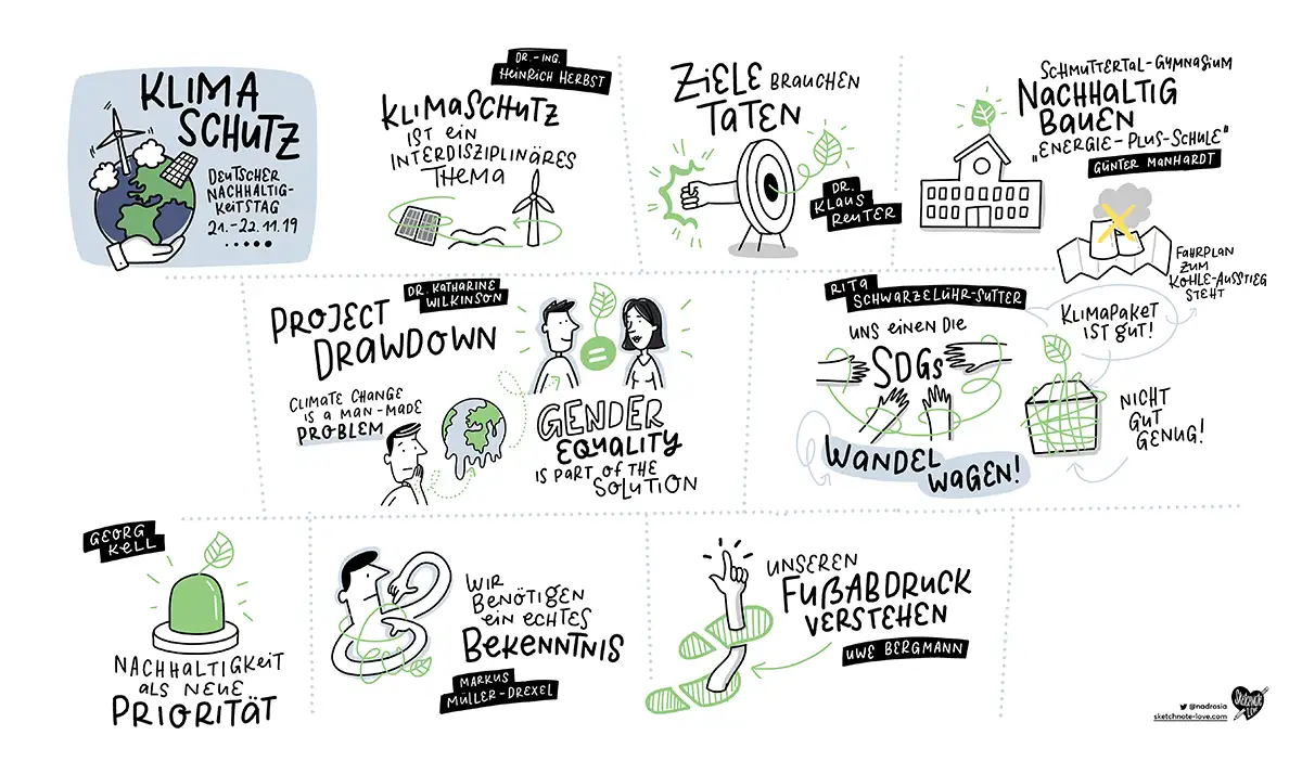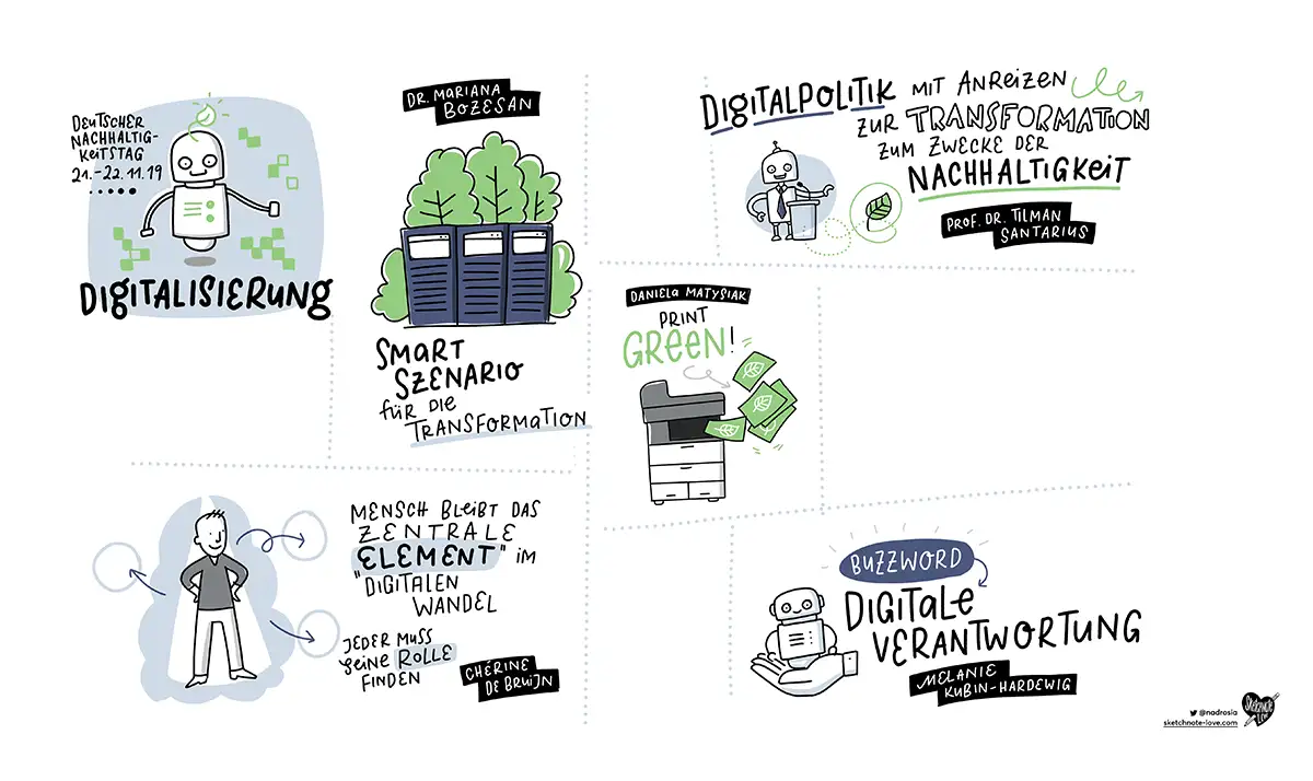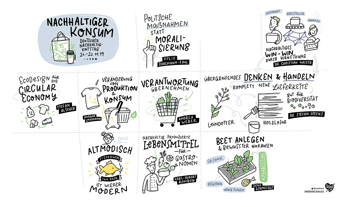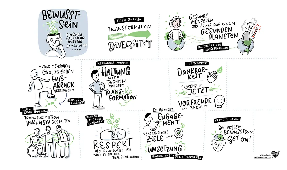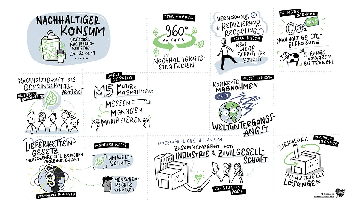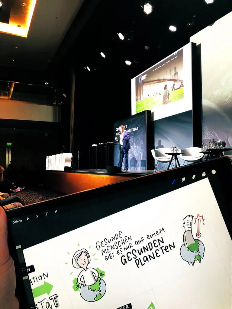 Im November 2019 dürfte ich den Deutschen Nachhaltigkeitspreis bei der Konferenz und Preisverleihung visuell begleiten. Das war kein klassisches Graphic Recording, denn ich habe nicht immer live protokolliert was auf der Bühne gesagt wurde. Stattdessen habe ich 100 Antworten visualisiert, die auf verschiedenen Bühnen von verschiedenen Akteuren gegeben wurden.