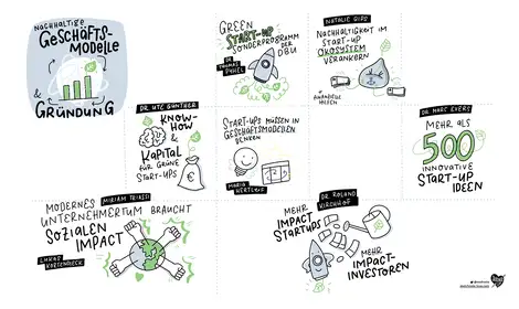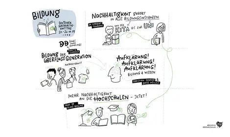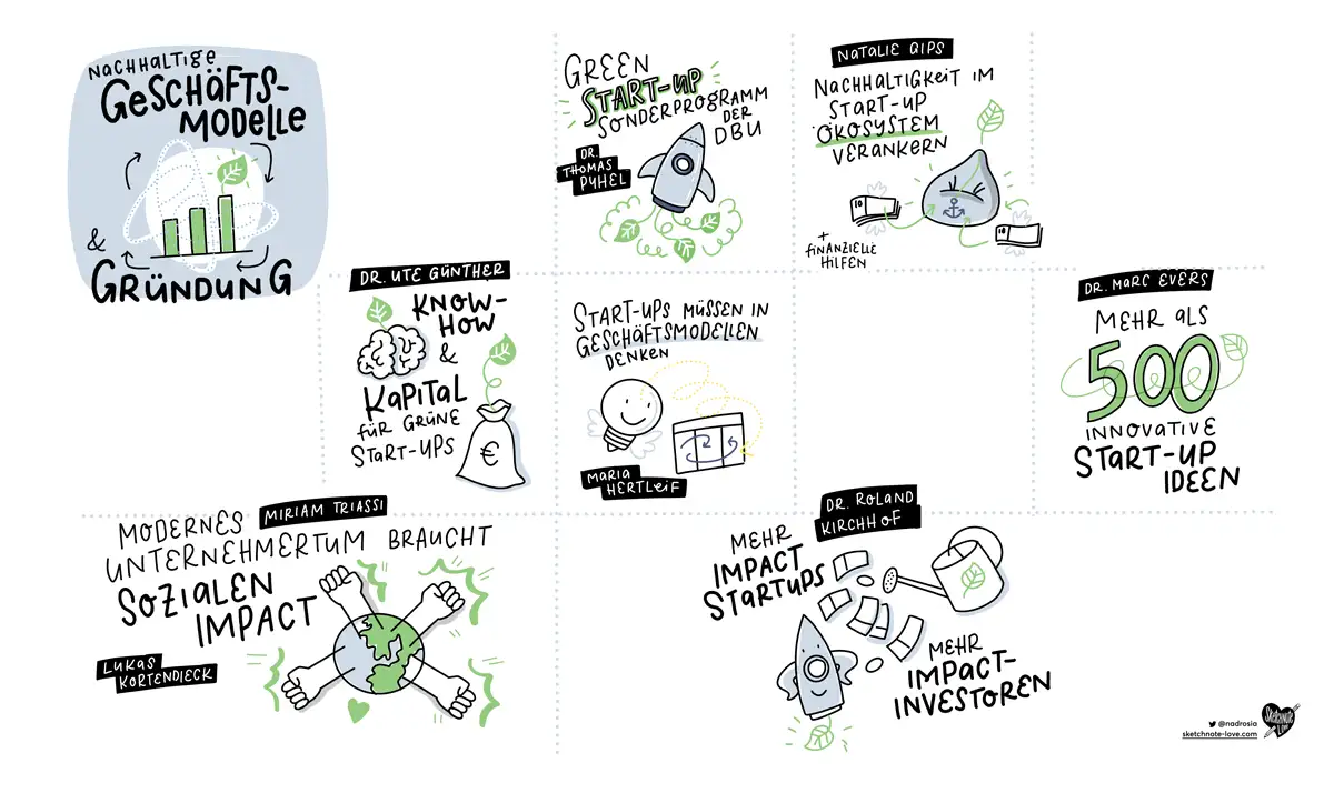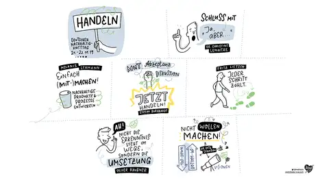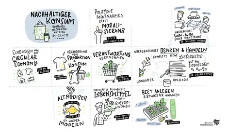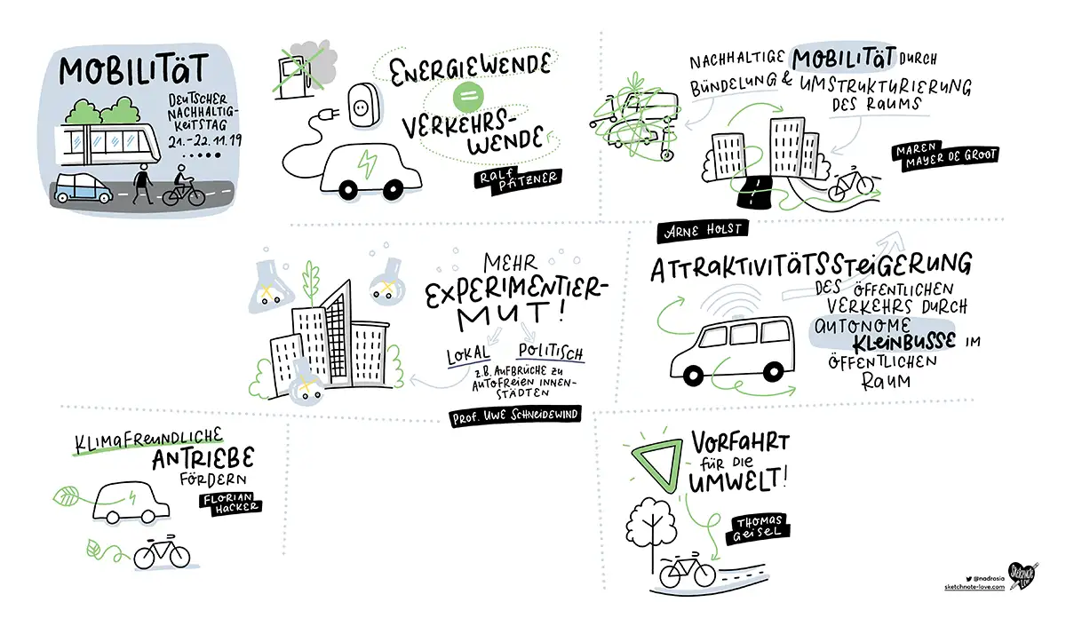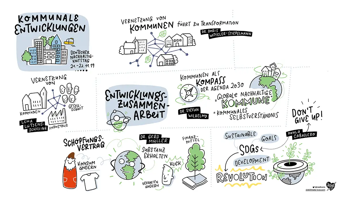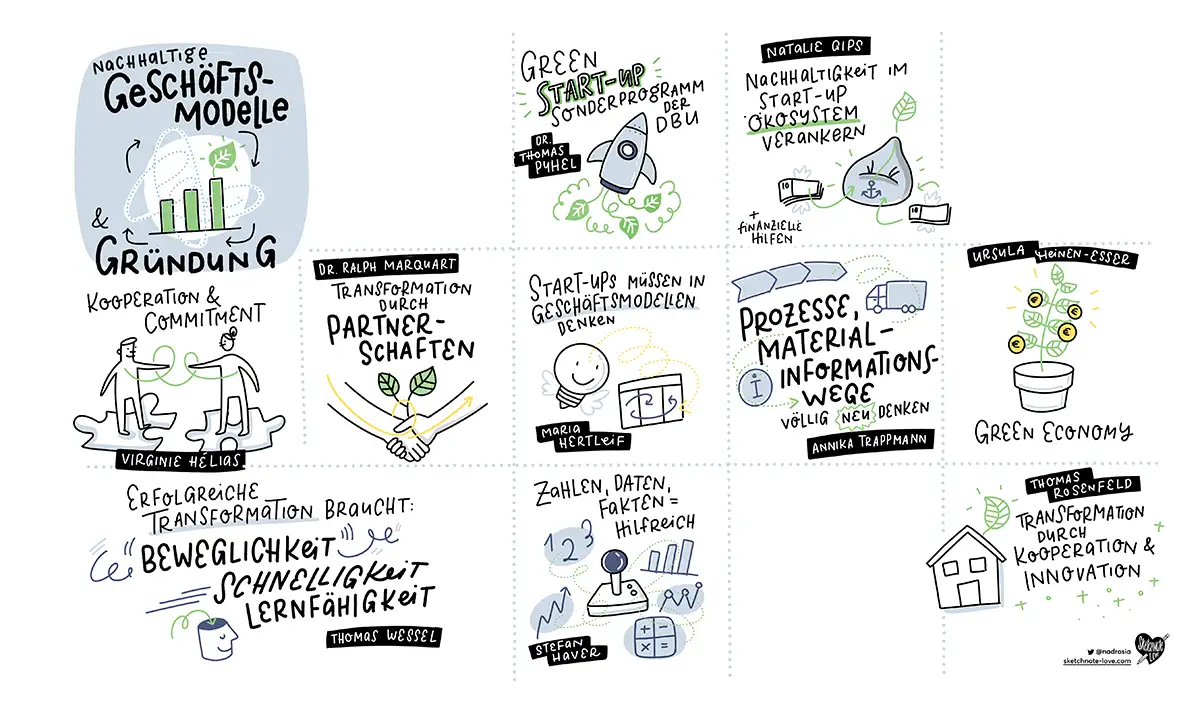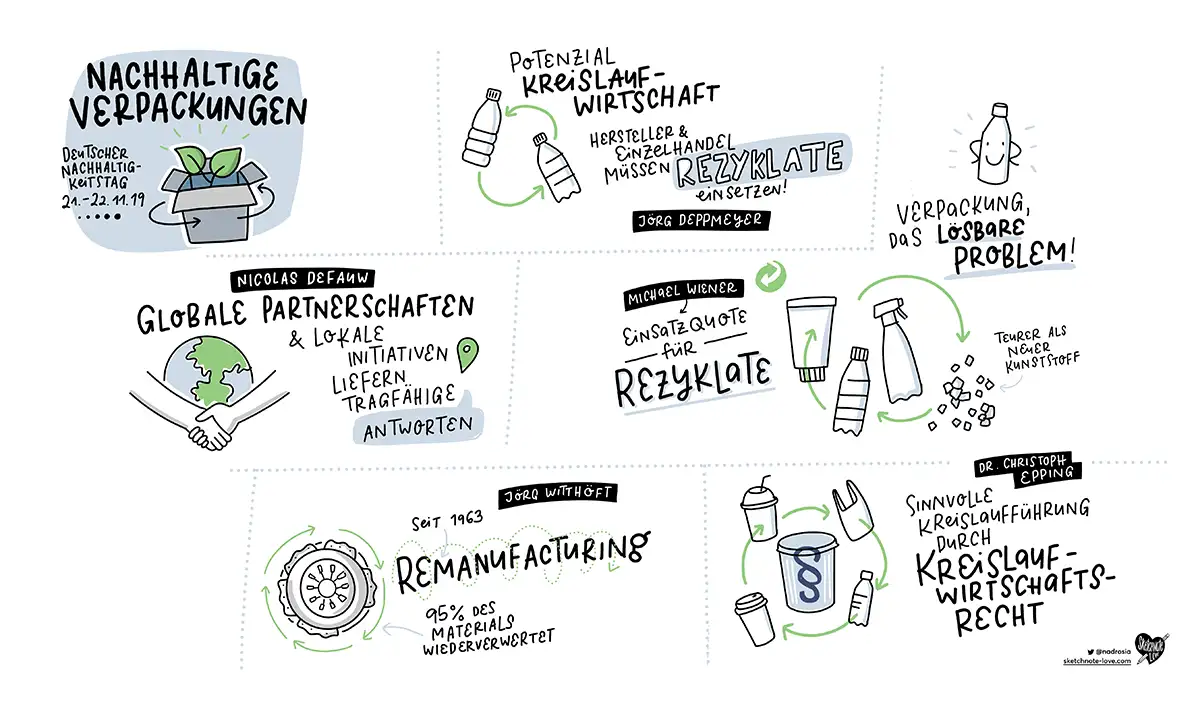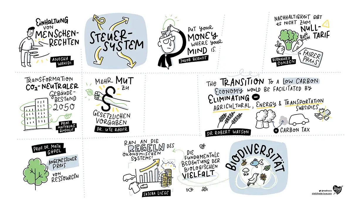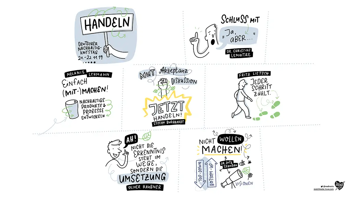 Im November 2019 dürfte ich den Deutschen Nachhaltigkeitspreis bei der Konferenz und Preisverleihung visuell begleiten. Das war kein klassisches Graphic Recording, denn ich habe nicht immer live protokolliert was auf der Bühne gesagt wurde. Stattdessen habe ich 100 Antworten visualisiert, die auf verschiedenen Bühnen von verschiedenen Akteuren gegeben wurden.