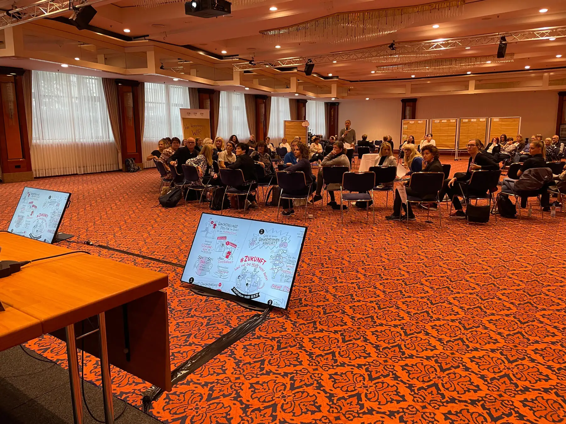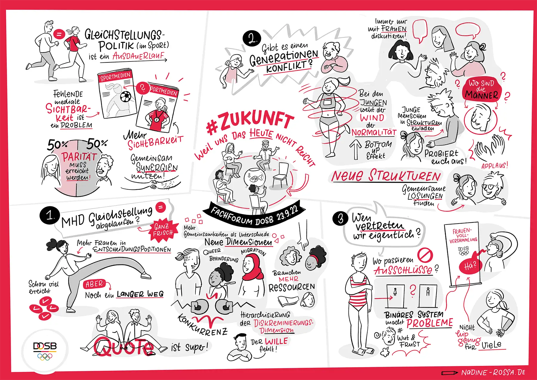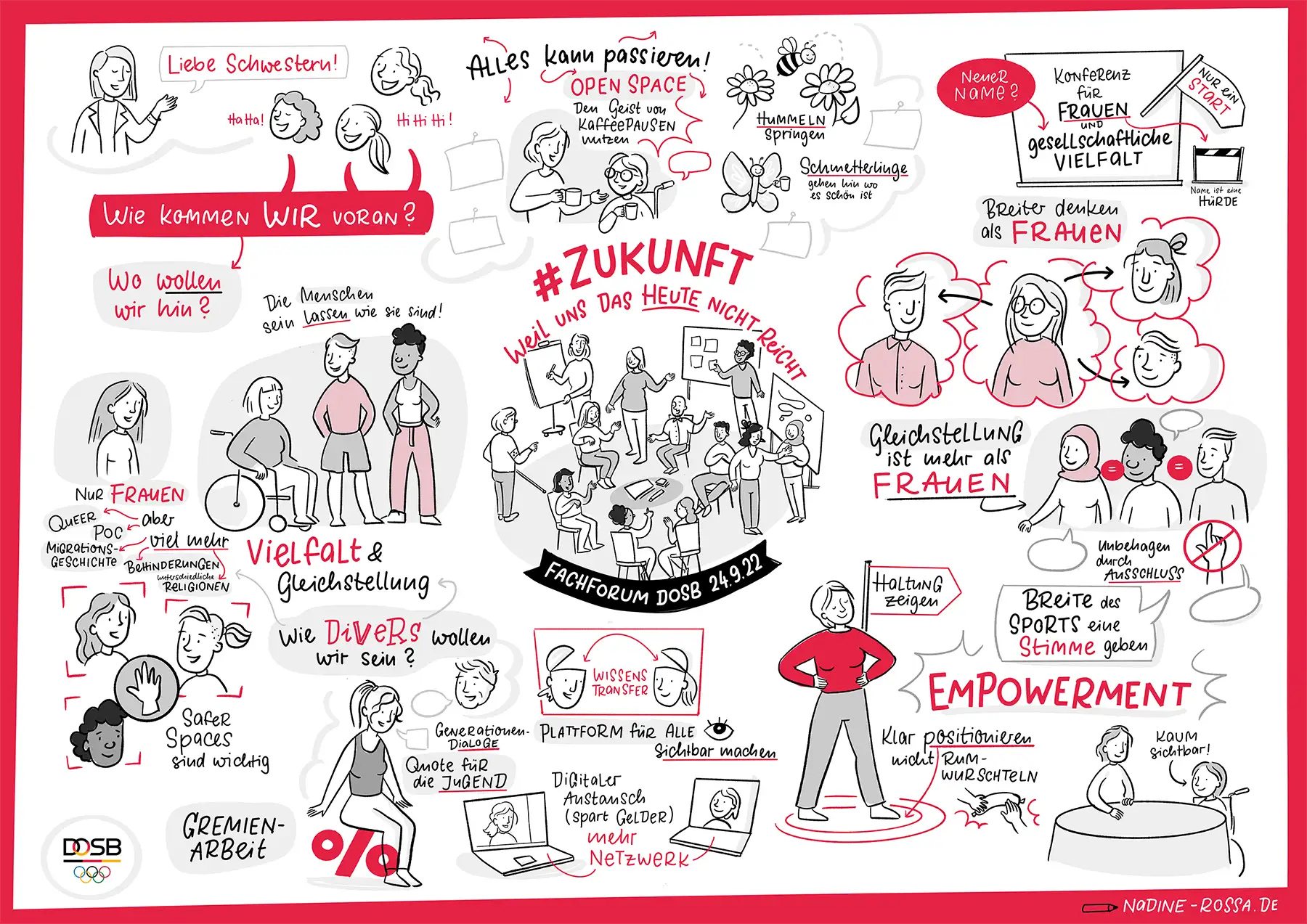 Ich befasse mich schon lange damit, wie man in Visualisierungen (also Graphic Recordings und Sketchnotes) Diversität abbildet und habe mich daher umso mehr über diesen Auftrag gefreut. Der Deutsche Olympische Sportbun (DOSB) bat mich im September 2022 das Fachforum #Zukunft visuell festzuhalten.