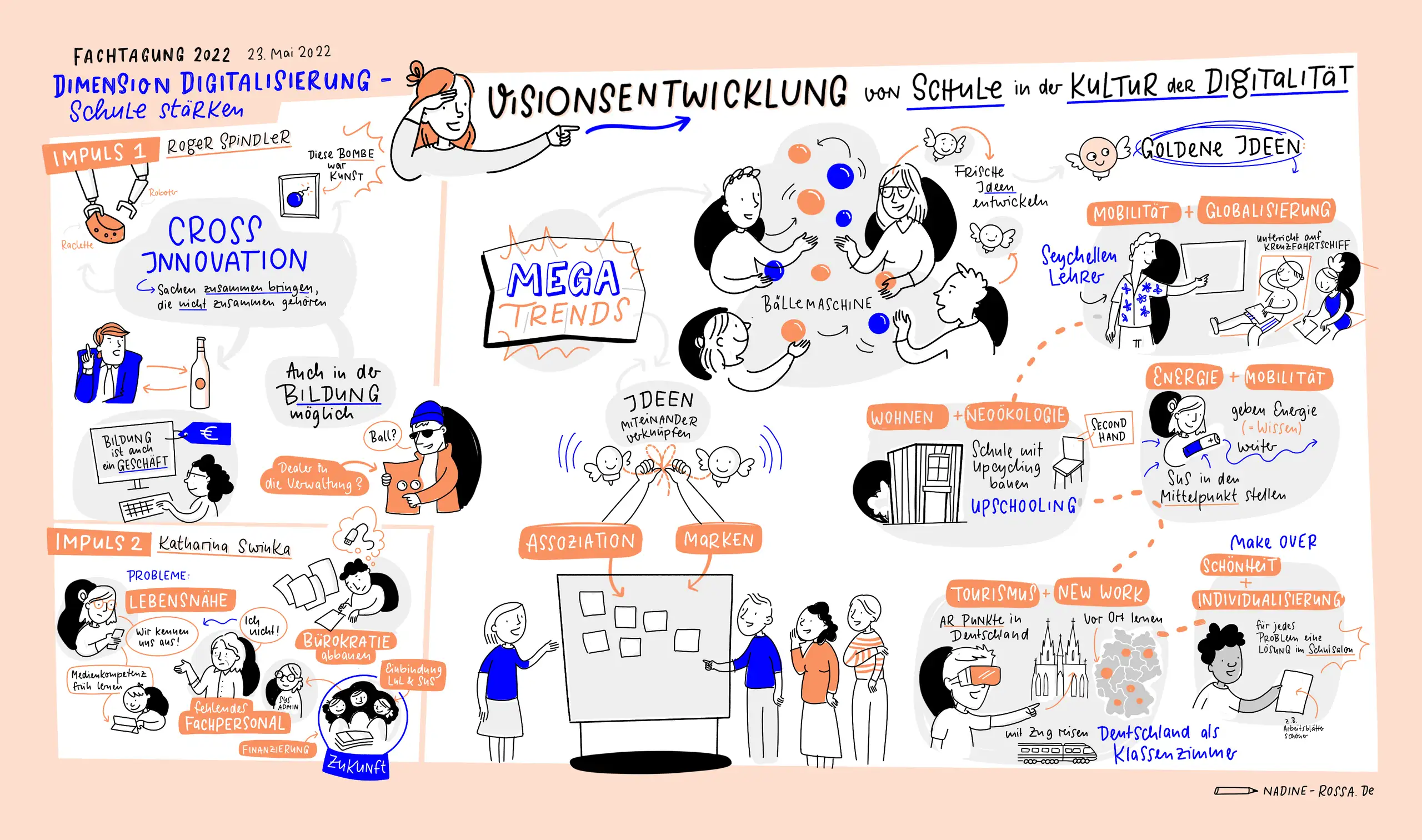 Ende Mai 2022 durfte ich hier in Berlin die Fachtagung des Forum Bildung Digitalisierung begleiten, bzw. einzelne Workshops davon. Mein Favorit war dabei die Visionsentwicklung von Schule in der Kultur der Digitalität, denn das war eine Art Kreativtraining für neue Bildungsideen. Roger Spindler stellte dabei die Idee der Cross Innovation vor und wandte sie mit den TeilnehmerInnen auch direkt vor Ort an.
