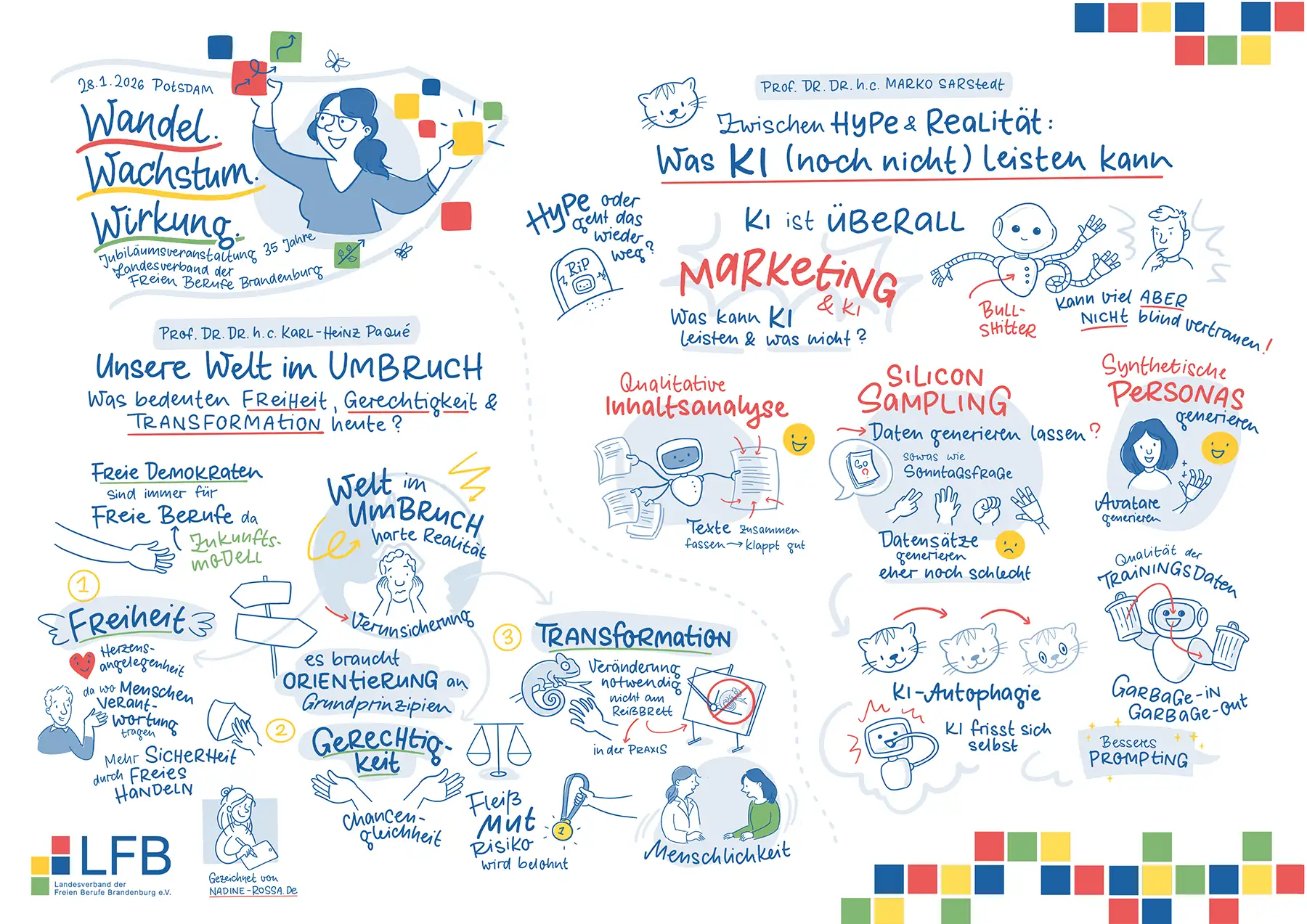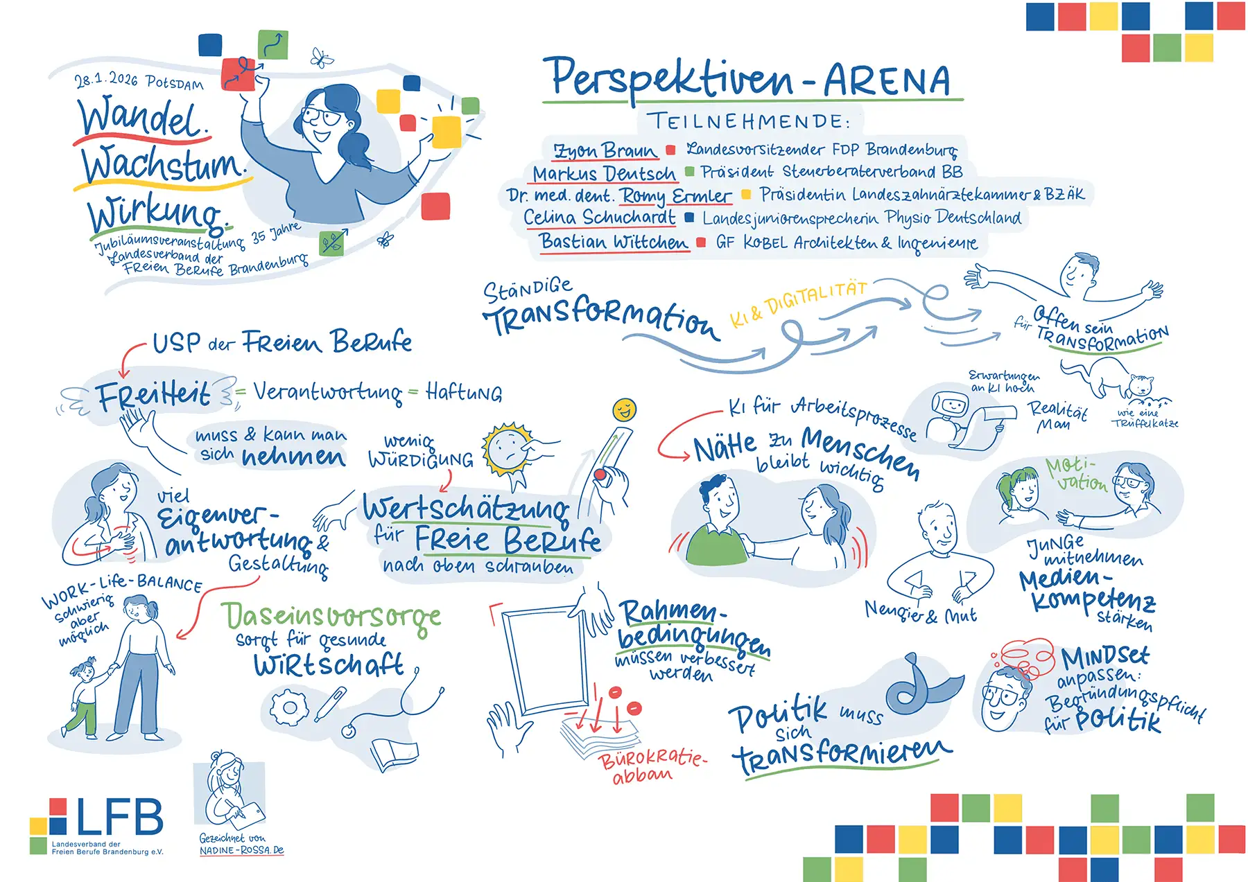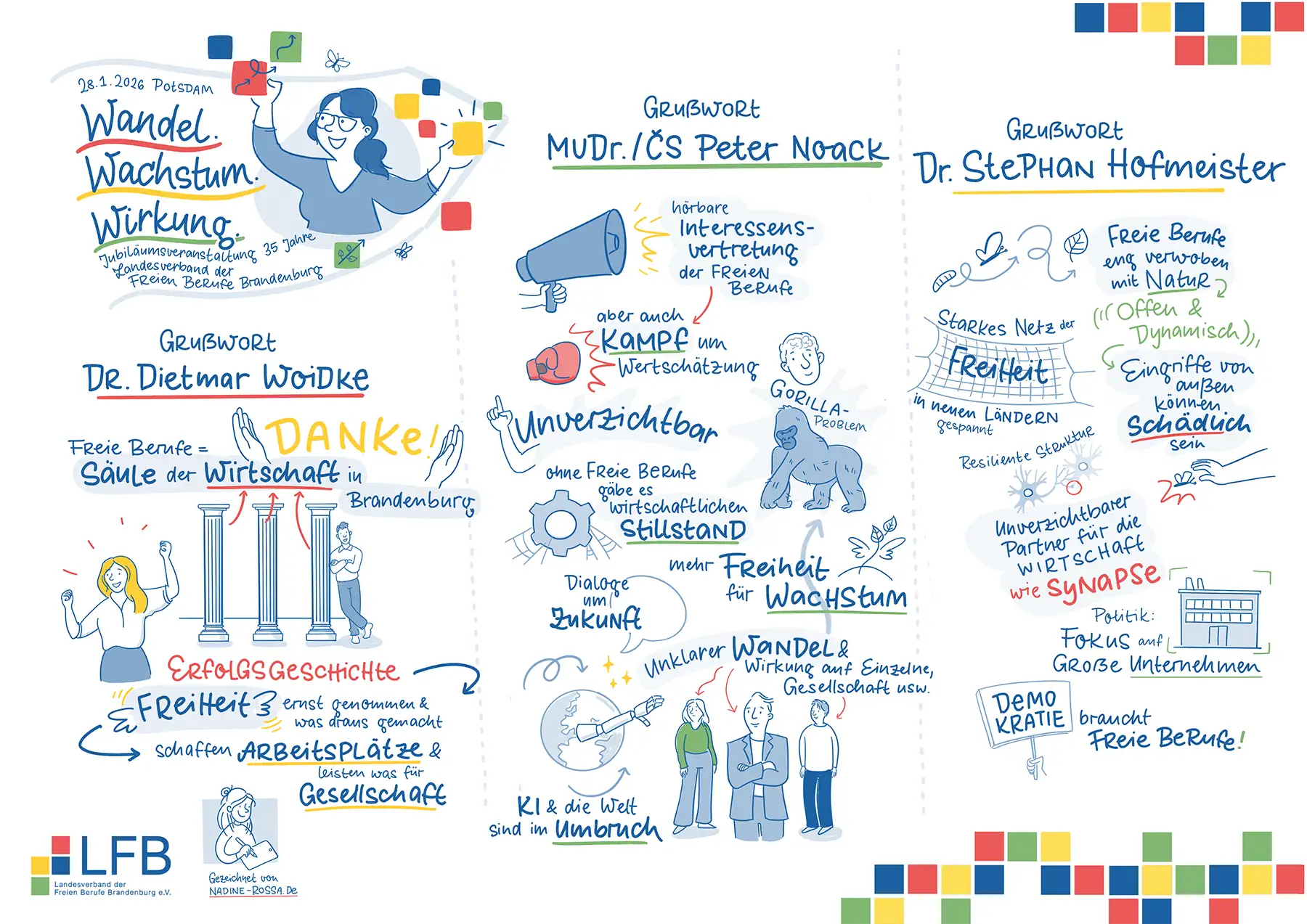 Der Landesverband der Freien Berufe lud Ende Januar 2026 zur Jubiläumsveranstaltung 35 Jahre Landesverband und ich durfte die Diskussionsrunde, Grußworte und Keynote visuell zusammenfassen.