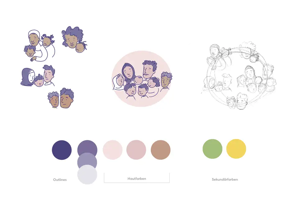 Erste Skizzen für die Logoentwicklung. Der Wunsch der Kundin war möglichst viele Familienformen und Typen abzubilden.Davon abgeleitet gab es dann erste Entwürfe und Farbkombinationen, die im Illustrationsprozess erweitert wurden.Das fertige Logo