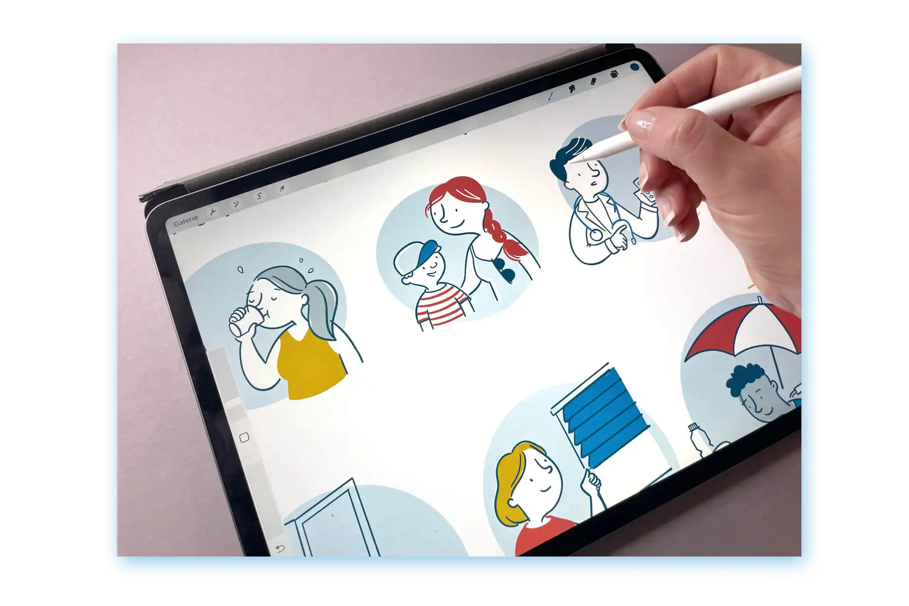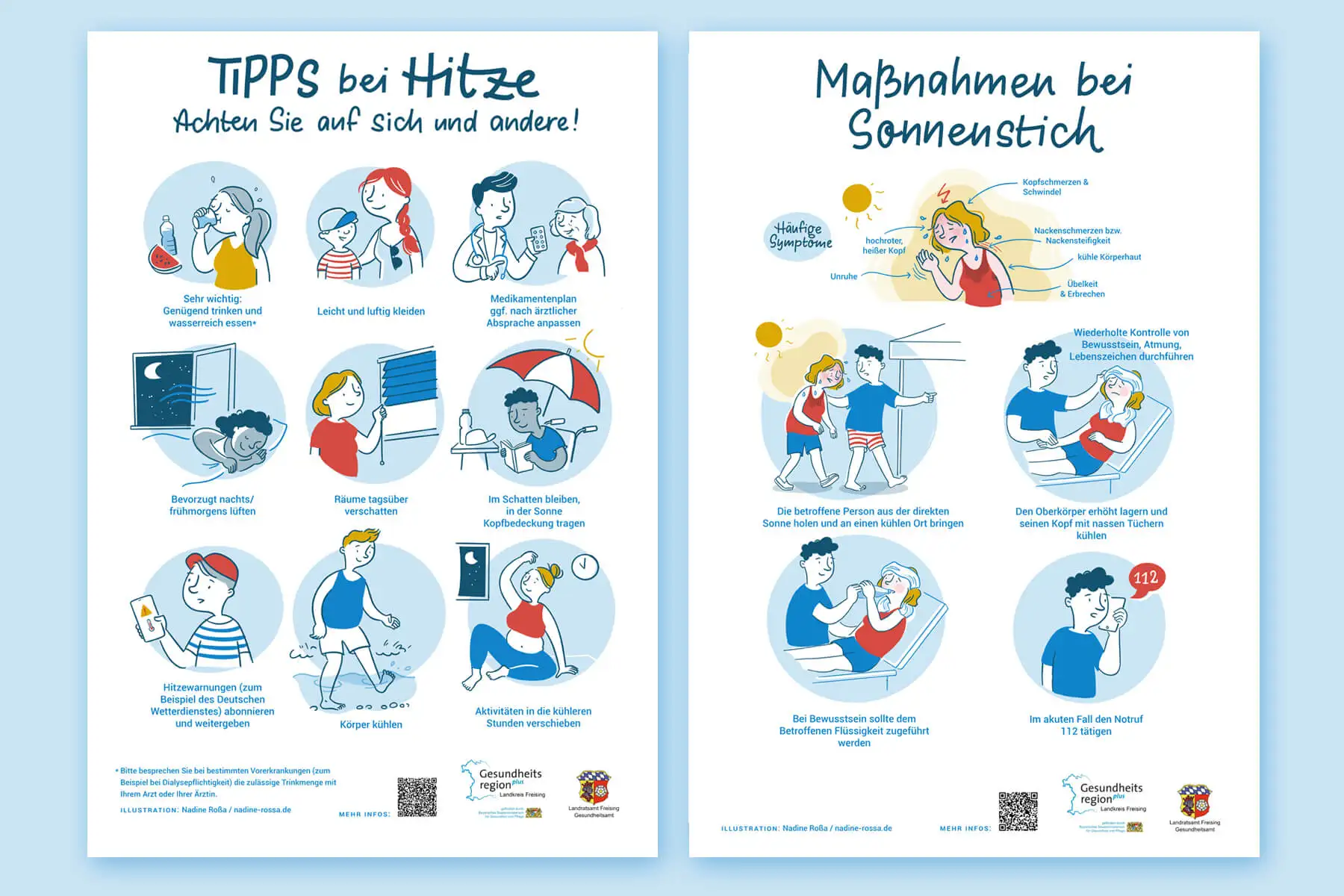 Für das Gesundheitsamt des Landratsamts Freising durfte ich Ende 2023 zwei Plakate gestalten. Beide sollten das Thema »Tipps für den Umgang mit Hitze« und »Umgang mit Sonnenstich« enthalten und zwar kurz und knapp, so dass sie in öffentlichen Einrichtungen wie Kitas, Ämtern etc. ausgehangen werden können. Die Illustrationen sind digital in Procreate gezeichnet und am Ende mit Text in Indesign gesetzt.