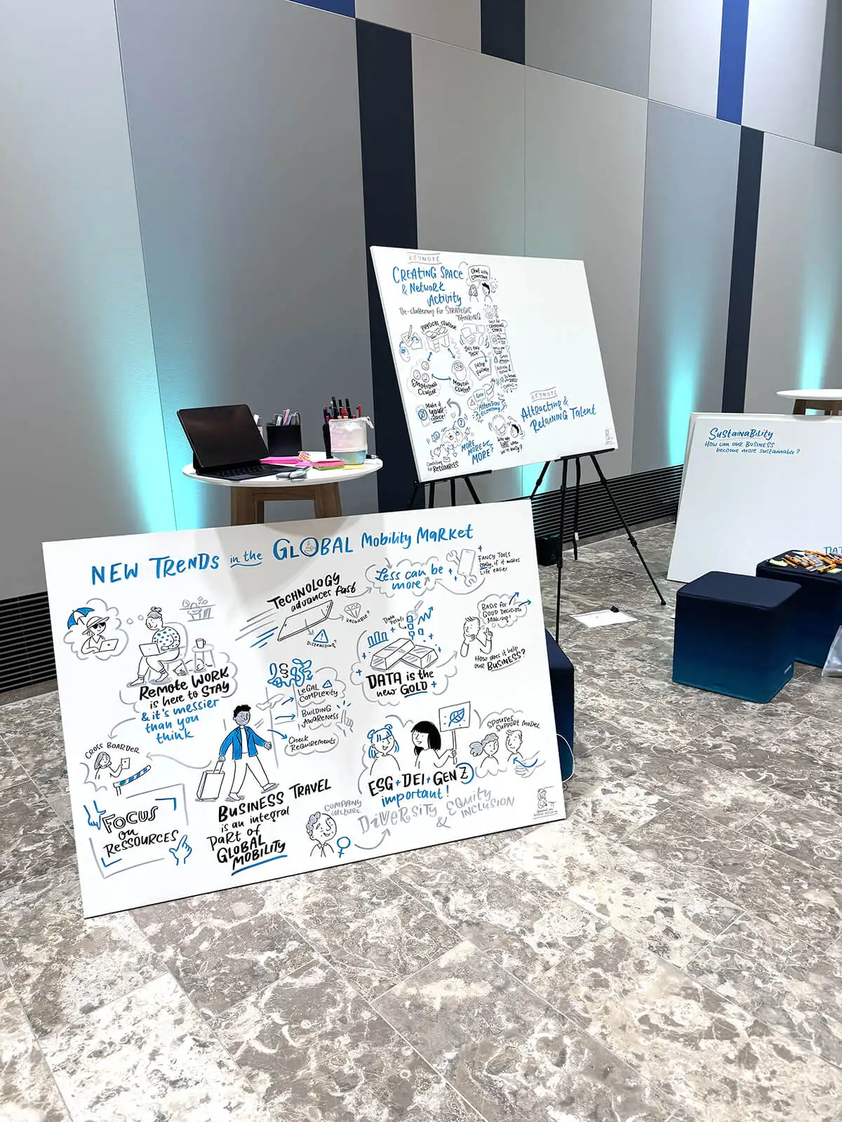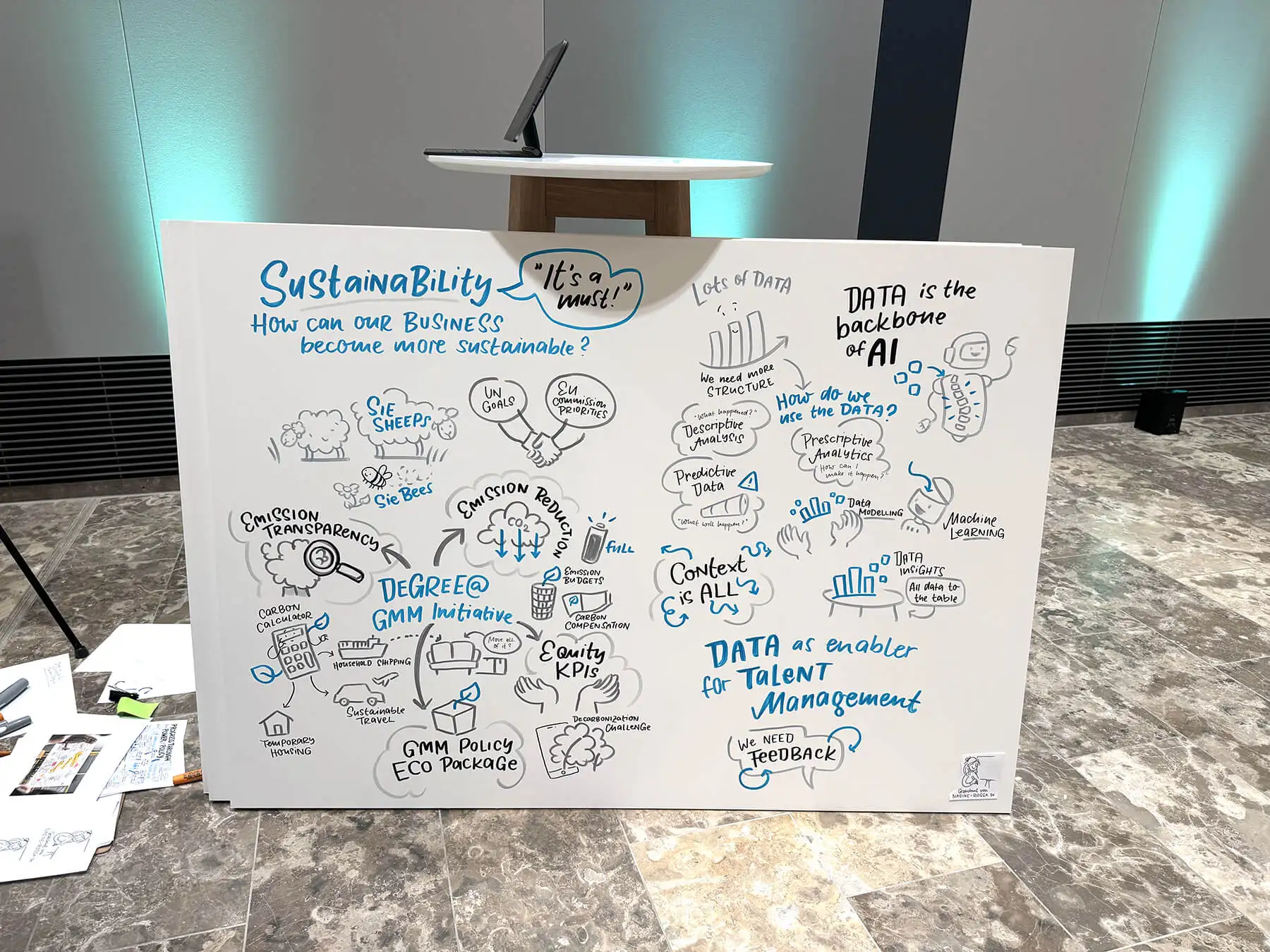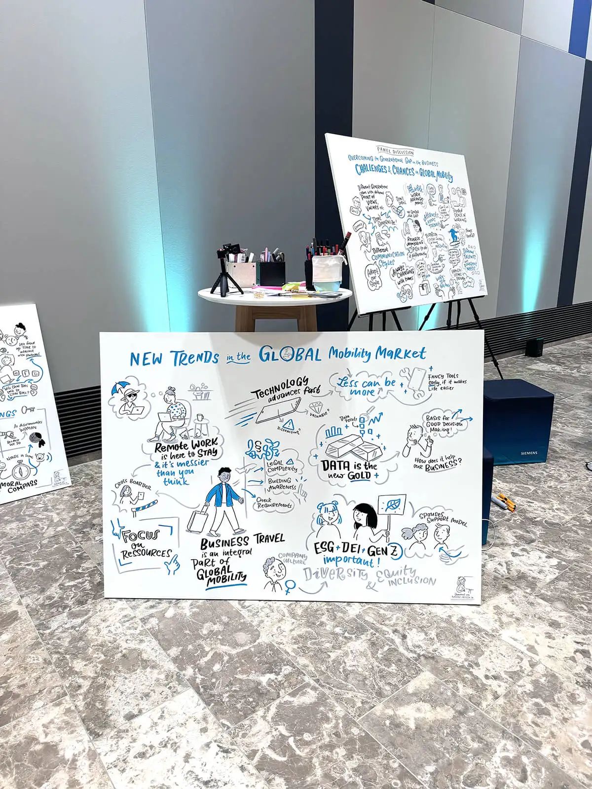 Aber ab und an mache ich auch analoge Graphic Recordings im großen Format und auch wenn ich meine digitalen Hacks da vermisse – ich denke schon auch immer: Hat ja doch schon auch was für sich so groß zu zeichnen. So war es hier bei diesem tollen Job für Siemens im Juni 2024 in dem es um die Trends im Global Mobility Markt ging.