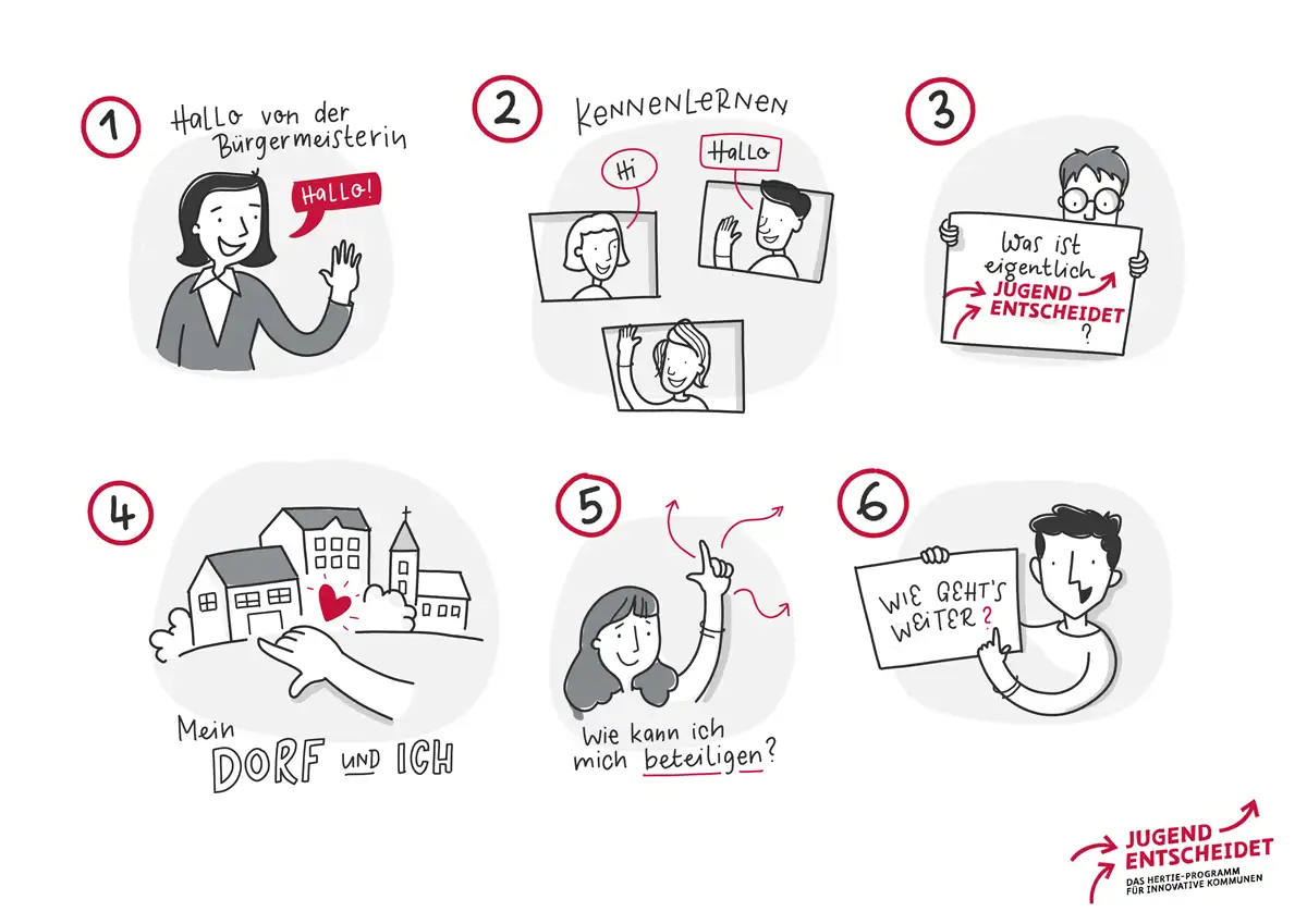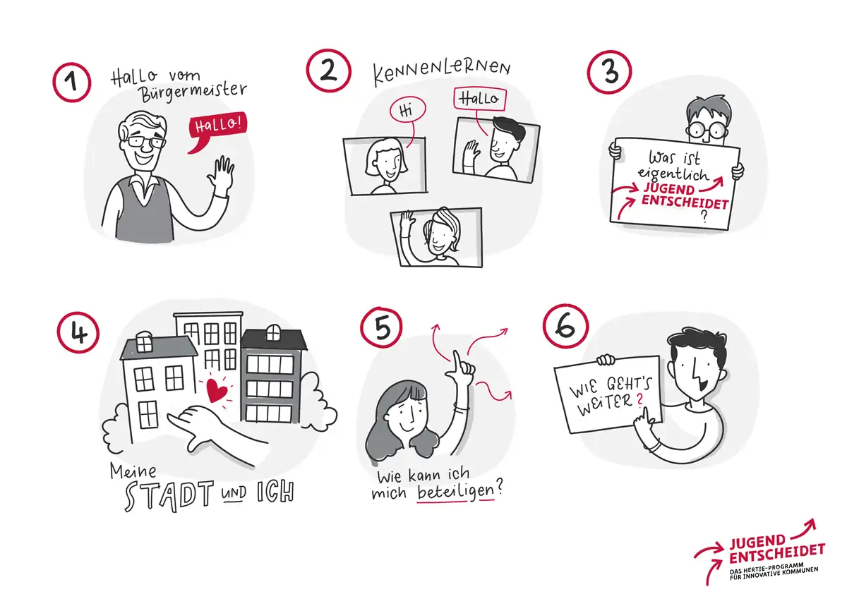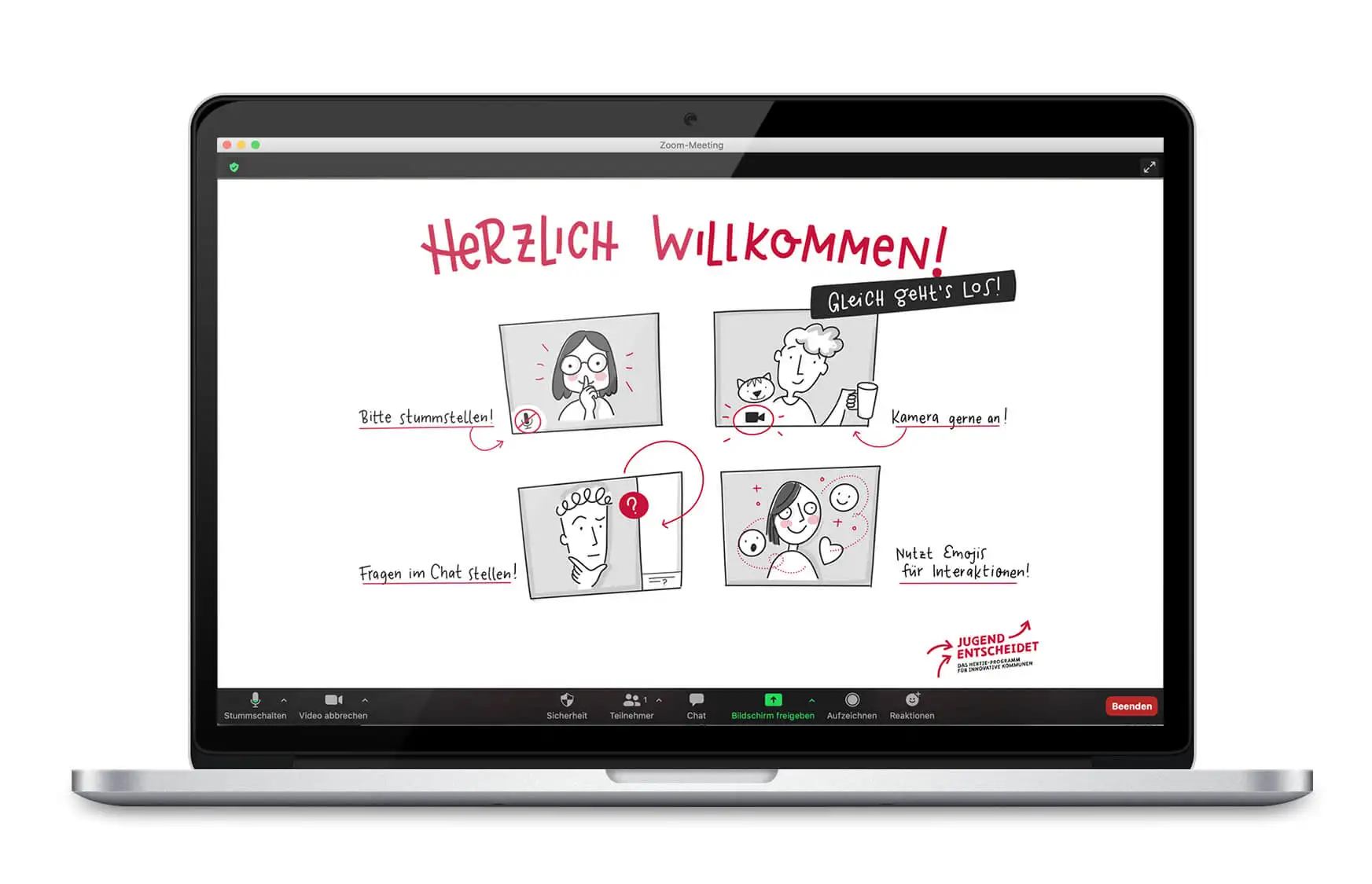 Für die gemeinnützige Hertie-Stiftung durfte ich für das Programm »Jugend entscheidet – das Hertie Programm für innovative Kommunen« Sketchnotes für die virtuellen Diskussionsrunden gestalten. Es ging viel um junge Menschen im öffentlichen Raum, in Städten und Dörfern.