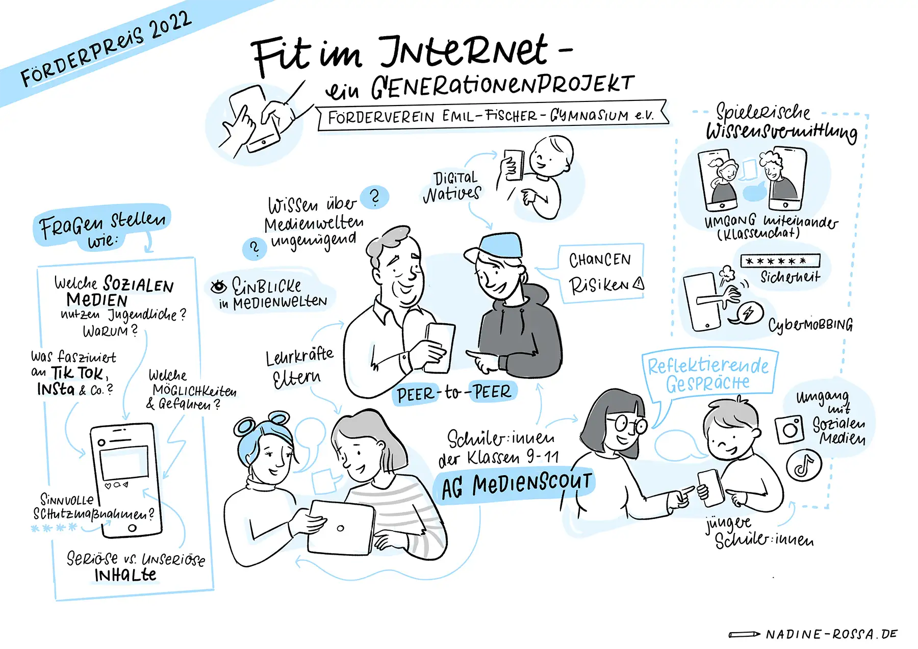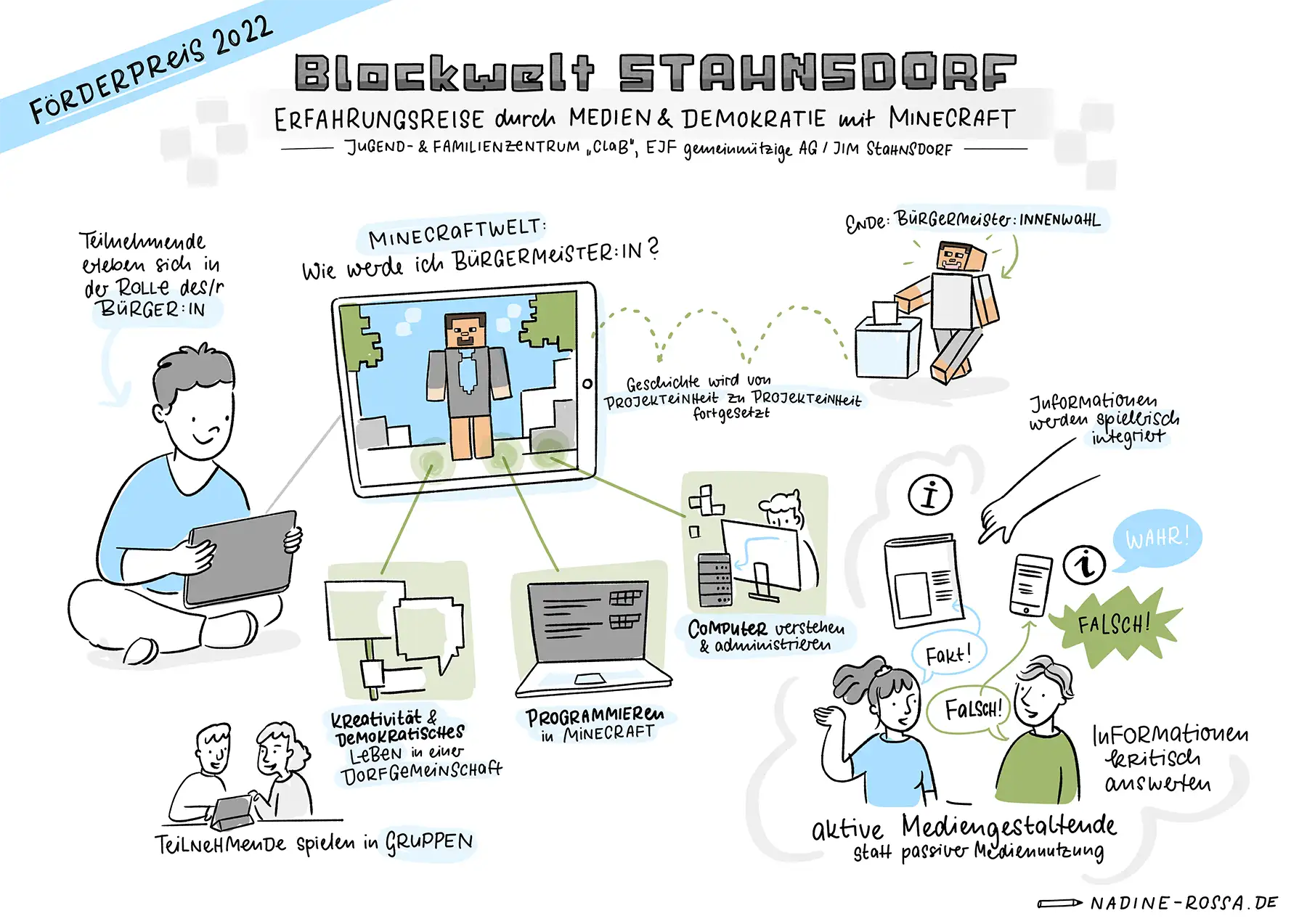 Für die Medienanstalt Berlin-Brandenburg (mabb) habe ich bereits einmal die Projektarbeiten in Sketchnote-Form zusammen gefasst und habe mich umso mehr gefreut, dass ich auch 2022 die Preisträger wieder illustrieren durfte.